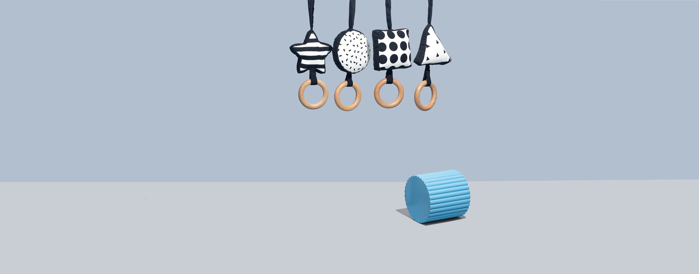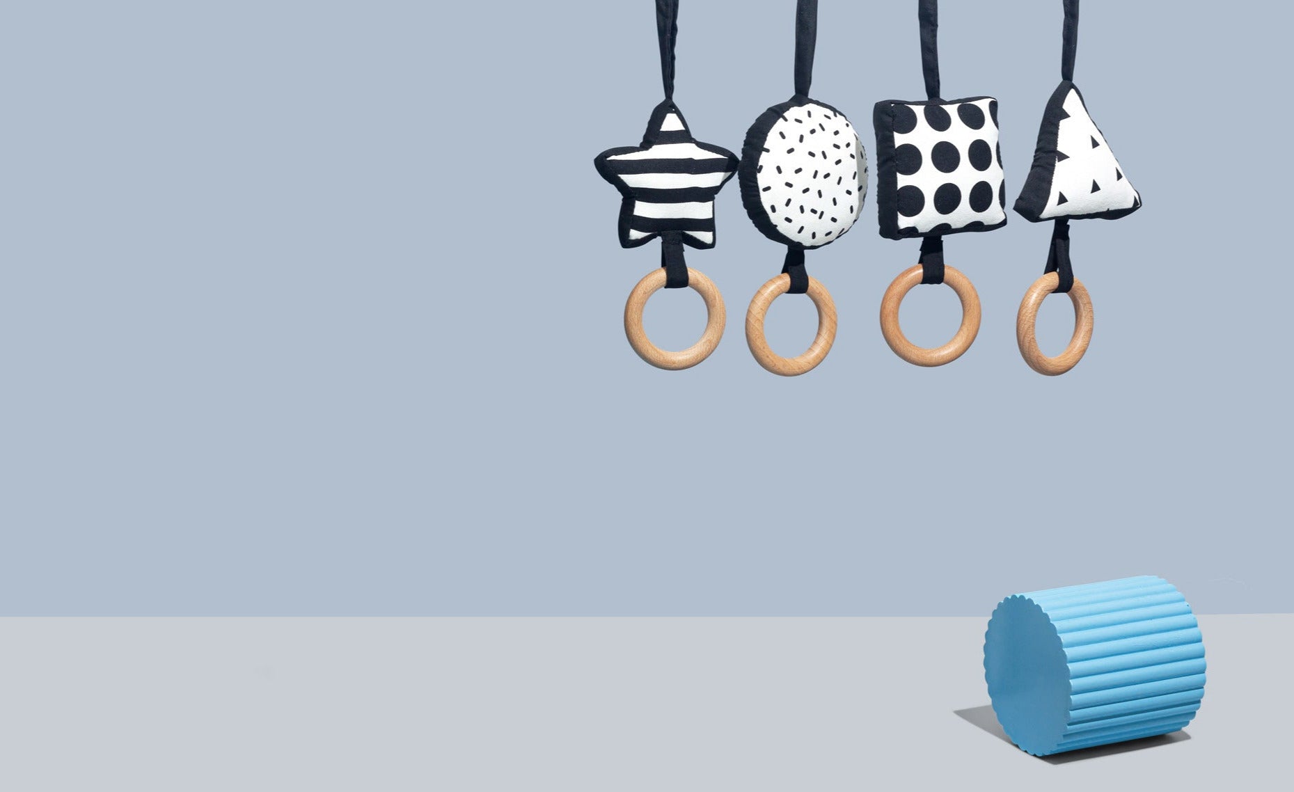 Designed to stimulate a newborn's developing visual system with high contrast black and white pendants.
